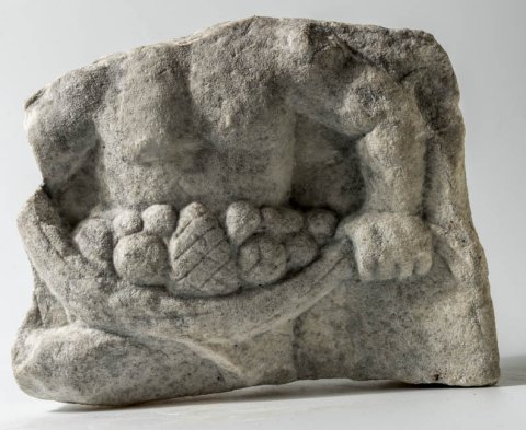 - Mythische Figur: Priapus mit nacktem Oberkörper, hält im Gewandbausch Früchte und Pinienzapfen.
