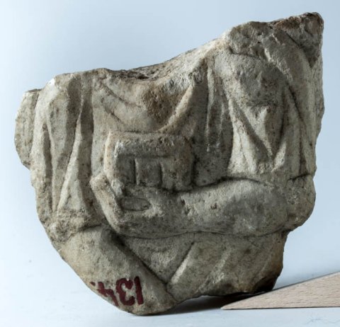 - Oberkörper einer bekleideten (Tunica mit kurzen Ärmeln) Person, die auf der linken Hand ein Kästchen (?) trägt. Diener von einem Grabrelief ?