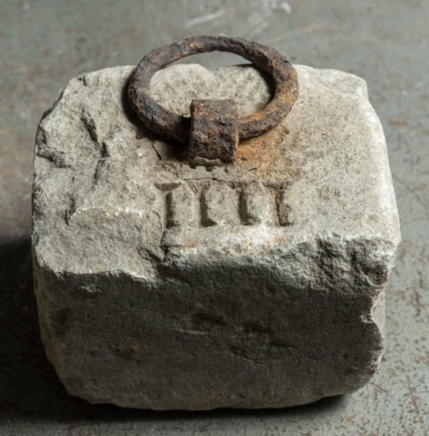 - kubischer Stein, auf der Oberseite Gewichstangabe