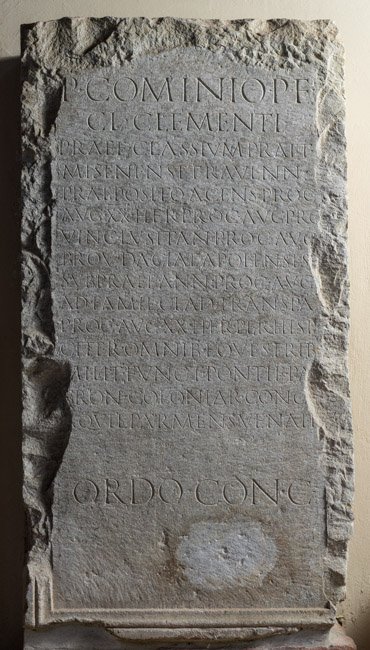 - P(ublio) Cominio P(ubli) f(ilio) / Cl(audia) Clementi / praef(ecto) classium praet(oriarum) / Misenens(is) et Ravenn(atis) / praeposito a cens(ibus) proc(uratori) / Aug(usti) XX her(editatium) proc(uratori) Aug(usti) pro/vinc(iae) Lusitan(iae) proc(uratori) Aug(usti) / prov(inciae) Daciae Apolensis(!) / subpraef(ecto) ann(onae) proc(uratori) Aug(usti) / ad famil(ias) glad(iatorias) Transpa(danam) / proc(uratori) Aug(usti) XX her(editatium) per Hisp(aniam) / citer(iorem) omnib(us) equestrib(us) / milit(iis) funct(o) pontif(ici) pa/tron(o) coloniar(um) Conc(ordiensium) / Aquil(eiensium) Parmens(ium) Venafr(anorum) / ordo Conc(ordiensium)