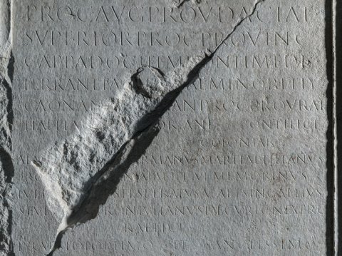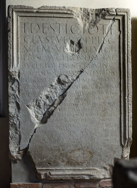 - T(ito) Desticio T(iti) f(ilio) / Cla(udia) Severo p(rimo) p(ilo) leg(ionis) / X Gem(inae) subpraef(ecto) vigil(um) / proc(uratori) Aug(usti) prov(inciae) Daciae / superior(is) proc(uratori) provinc(iae) / Cappadoc(iae) item Ponti medi/terran(ei) et Arme[ni]ae minor(is) et Ly/caon(iae) An[tioch]ian(ae) proc(uratori) prov(inciae) Rae/tiae fla[mini divi Ha]driani pontifici / [patrono] coloniae / ala[e I Fl(aviae) Gemell(ianae?) --- Ge]rmanus Martial(ius) Titianus / Fro[---]an(us) alae I Fl(aviae) Iulius Memorinus / Iuli[us ---]s Fl(avius) Speratus alae I sing(ularium) Aelius / Sever[us Pe]tron(ius) Iulianus decurion(es) exerc(itus) / Raetici / praesidi optimo et sanctissimo / l(ocus) d(atus) d(ecreto) d(ecurionum)