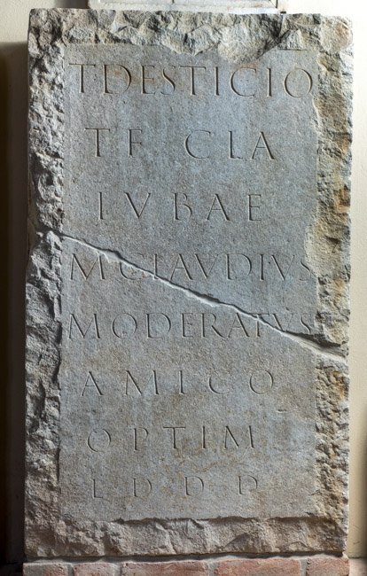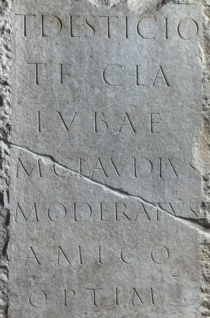 - T(ito) Desticio / T(iti) f(ilio) Cla(udia) / Iubae / M(arcus) Claudius / Moderatus / amico / optim(o) / l(ocus) d(atus) d(ecreto) d(ecurionum)
