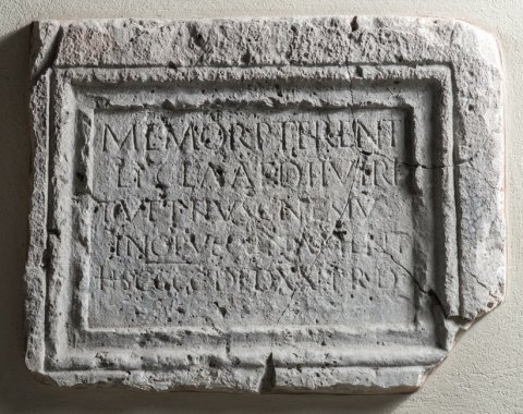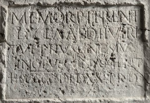 - Memor(iae) P(ubli) Terenti / L(uci) f(ilii) Cla(udia) aed(ilis) IIviri / T(itus) Vettius Gnesius / in opus ornament(a) / HS CCCC(milibus) ded(ucta) XX(vicesima) p(opuli) R(omani) d(edit)