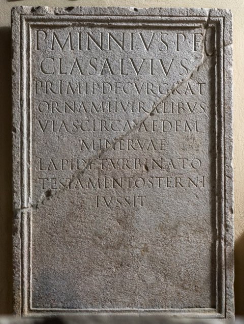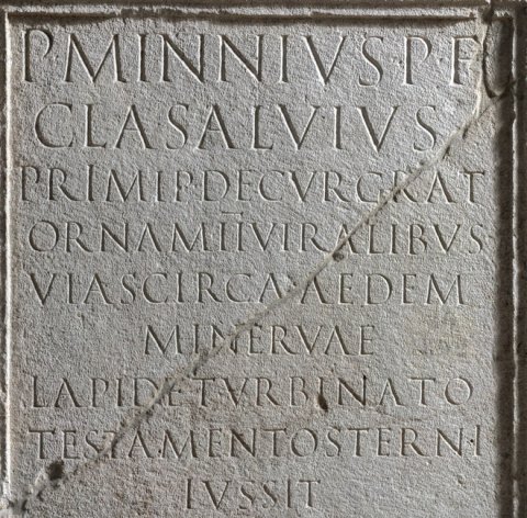 - P(ublius) Minnius P(ubli) f(ilius) / Cla(udia) Salvius / primip(ilus!) decur(io) grat(uitus) / ornam(entis) IIviralibus / vias circa aedem / Minervae / lapide turbinato / testamento sterni / iussit