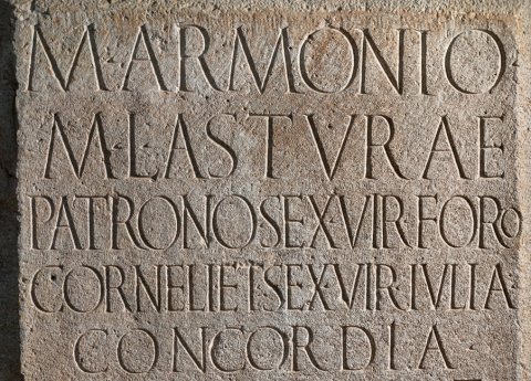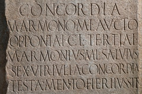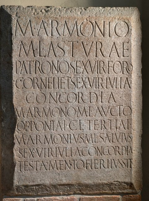 - M(arco) Armonio / M(arci) l(iberto) Asturae / patrono sevir(o) Foro / Corneli et sexvir(o) Iulia / Concordia / M(arco) Armon(i)o M(arci) l(iberto) Aucto / Opponiai(!) C(ai) l(iberto) Tertiai(!) / M(arcus) Armonius M(arci) l(ibertus) Salvius / sexvir Iulia Concordia / testamento fieri iussit