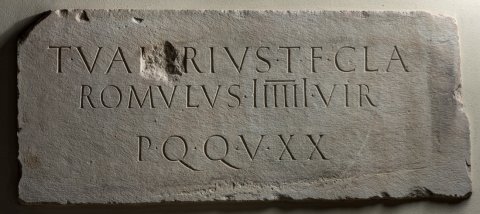 - T(itus) Valerius T(iti) f(ilius) Cla(udia) / Romulus IIIIIIvir / p(edes) q(uo)q(uo)v(ersus) XX