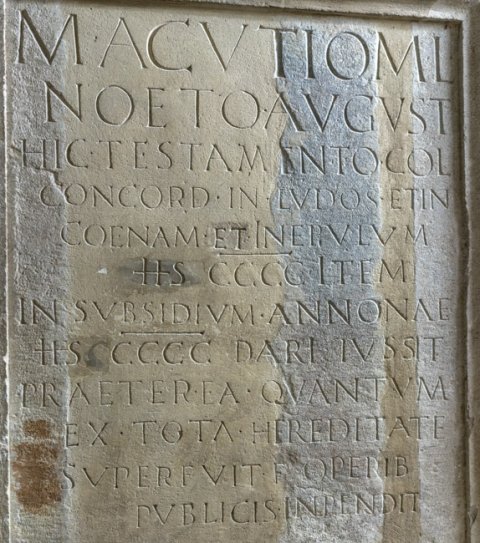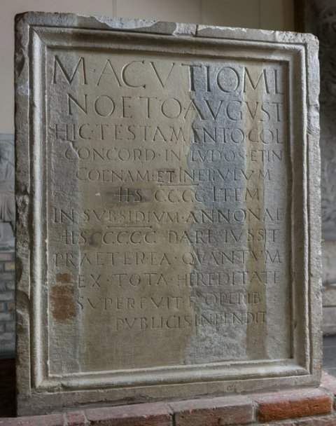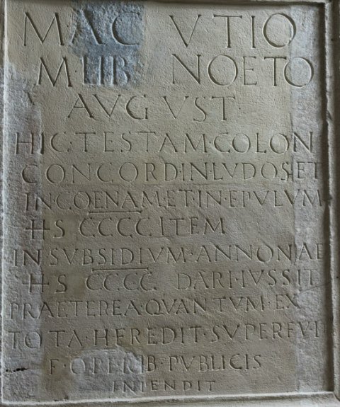 - M(arco) [Acu]tio M(arci) l(iberto) / N[oeto] Aug[u]st(ali) / hi[c testam]ento [c]ol(oniae) / C[oncord(iae) in] ludos [et] in / c[oenam et i]n epulum / [HS CCC]C (quadringenti milia) ite[m] / in [subsidium] anno[n]ae / HS [CCCC (milia) d]ari iu[ss]it / pr[aeterea q]uant[u]m / e[x tota h]eredit[a]te / s[uperfuit] f(ilius) oper[ib(us)] / [publicis] inpend[it] // [M(arco)] Acu[ti]o / M(arci) lib(erto) No[et]o / [Aug]ust(ali) / hi[c test]am(ento) c[ol(oniae) Co]n/c[ord(iae) et or]dini [in lud(os)] et / in [cenam?] et in [epul]um / H[S] [CCC(milibus) item] / in [susidiu]m a[nnon]ae / H[S CCCC] dar[i iussi]t / pra[eterea q]uant[um e]x / to[ta here]dit(ate) s[uperf]uit / f(ilius) operi[b(us)] publ[icis] / inp[endit]