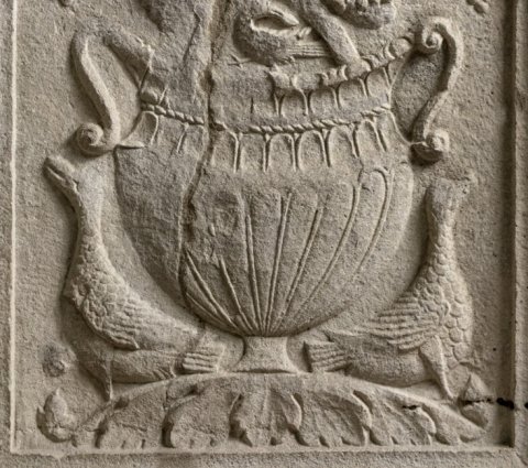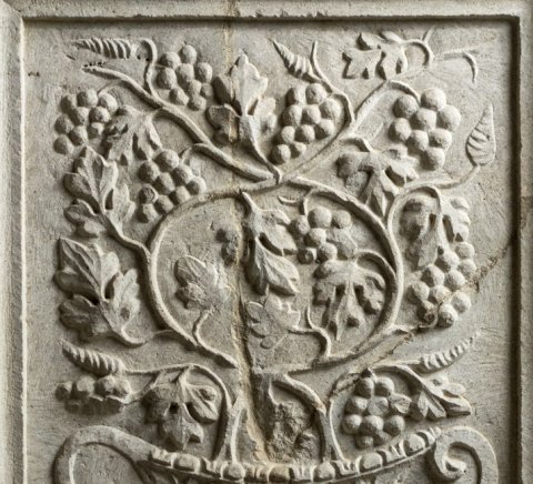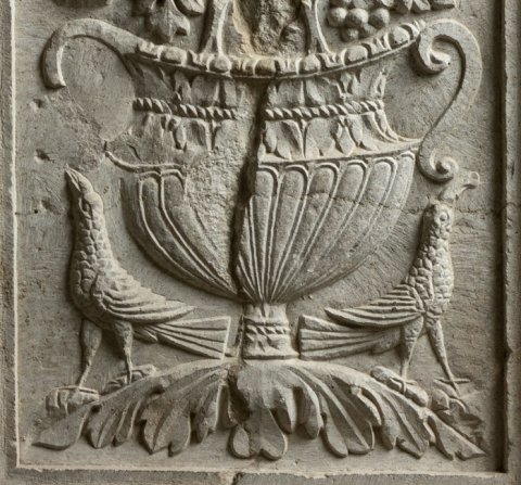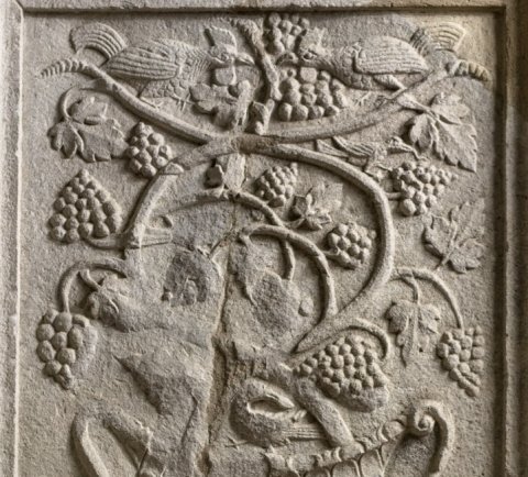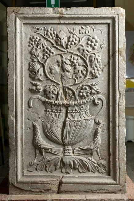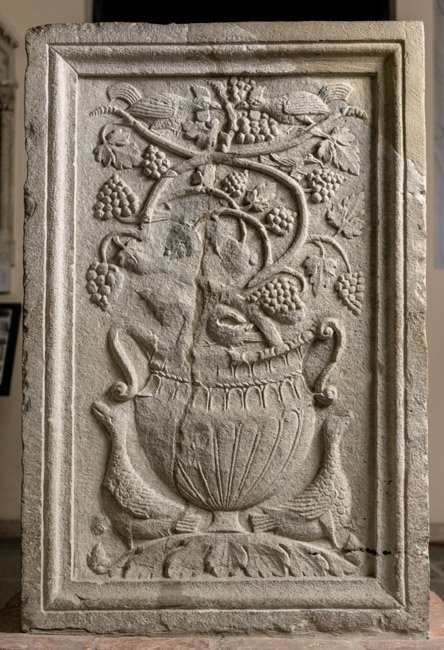 - Auf den beiden Nebenseiten jeweils ein Krater mit Weinranken, flankiert von Vögeln, auf dem einen Krater oben zwei Hähne. Das Sockelprofil (Kymation) des Grabaltars ist am Baldachin des Madonnenreliefs erhalten.