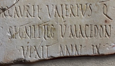 - D(is) M(anibus) / M(arcus) Aurel(ius) Valerius q(uondam?) / signif(er) leg(ionis) V Macedon(icae) / vixit ann(os) LX / [---