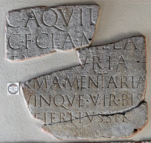 - C(aius) Aquillius / C(ai) f(ilius) Cla(udia) Mela / ex decuria / [a]rmamentaria / [qu]inquevir bis / fieri iussit