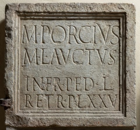- M(arcus) Porcius / M(arci) l(ibertus) Auctus / in fr(onte) ped(es) L / retr(o) p(edes) LXXV