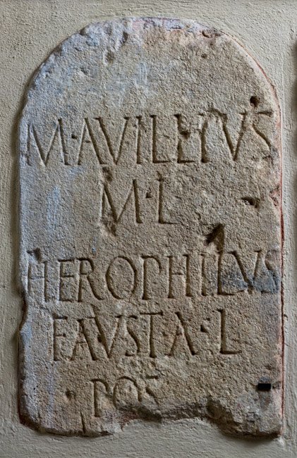 - M(arcus) Avillius / M(arci) l(ibertus) / Herophilus / Fausta l(iberta) / pos(uit)