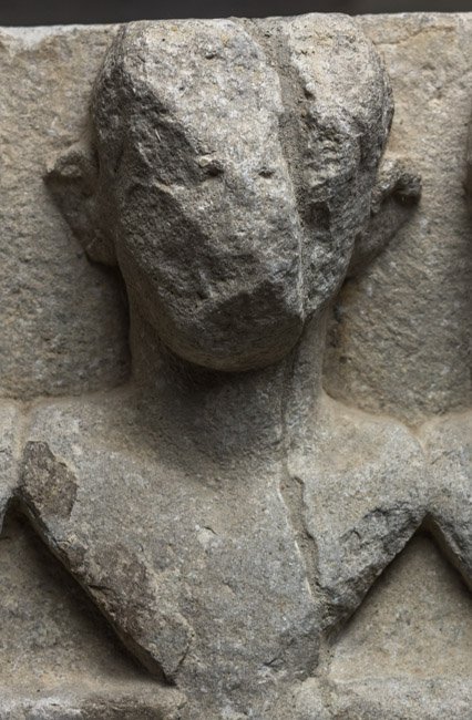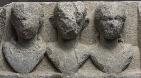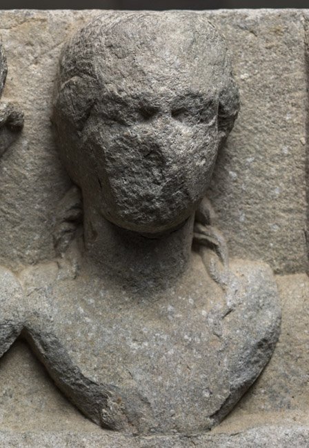 - Über der rahmenlosen Inschrift rechteckige Nische mit drei Büsten: bartloser Mann zwischen zwei Frauen mit Schulterlocken, die linke mit Halskette.
