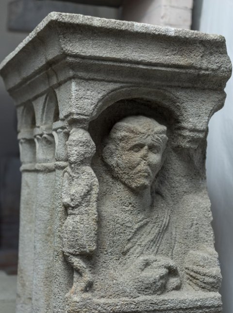 - Vorderseite: über der gerahmten Inschrift Nische mit zwei (?) Bögen, darin Halbfiguren von zwei Personen (Ehepaar). Auf der erhaltenen Nebenseite zwei Bögen auf drei Säulen mit Blattkapitellen. An der Ecke Attisfigur. Oben profilierte Deckplatte.