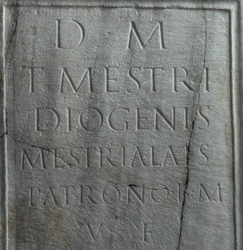 - D(is) M(anibus) / T(iti) Mestri / Diogenis / Mestria Lais / patrono b(ene) m(erenti) / v(iva) f(ecit)