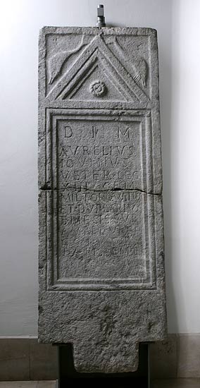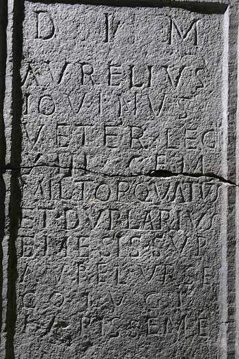 - D(is) I(nferis) M(anibus) / Aurelius / Iovinus / veter(anus) leg(ionis) / XIII gem(inae) / mil(es) torquatus / et duplarius / e M(o)esis sup(erioris) / Aurel(iae) Urs(a)e / co(n)iugi / karissem(a)e (!)