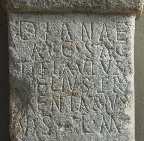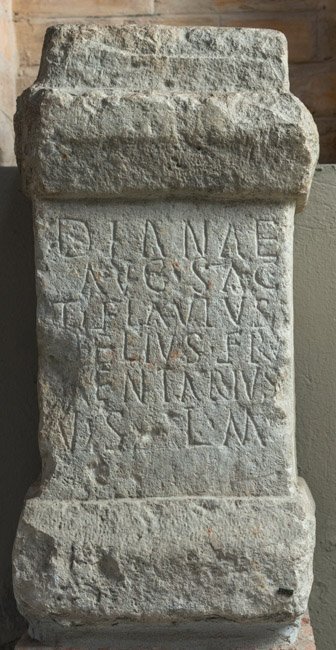 - Dianae / Aug(ustae) sac(rum) / T(itus) Flavius / [H]elius fru/[m]entarius / v(otum) s(olvit) l(ibens) m(erito)