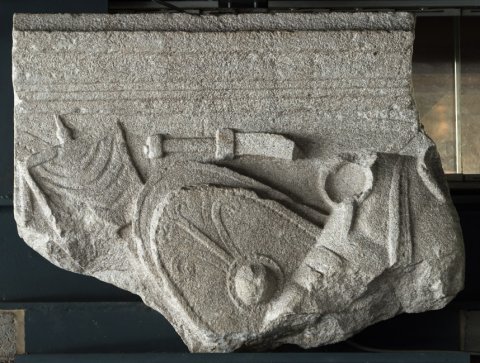 - Waffen: vexillum, Schilde, Schwert, Panzer. Oben profiliertes Gesims.