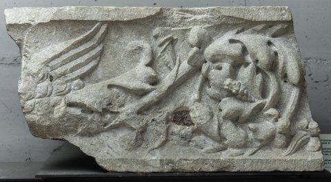 - Akanthusranken, Flügel eines Mischwesens aus Tierprotome und Rankenleib (?).