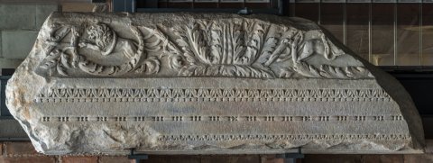 - Fries mit zentralem Akanthuskelch und davon ausgehenden Spiralranken mit Löwen. Unterhalb Fascien mit Kymation, Perlstab, Astragalstab und Kymation. Auf der Unterseite Soffitte mit Flechtband mit Rosette.