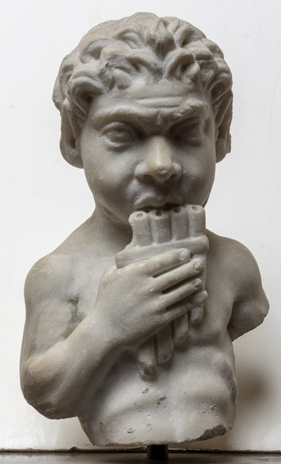 - Mythische Figur, Musikinstrument: jugendlicher Pan (Paniskos), auf der Syrinx spielend.