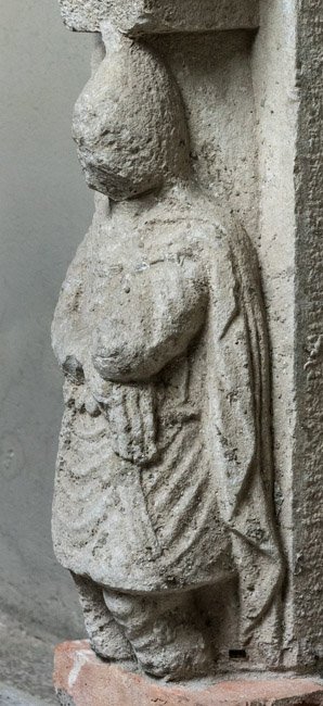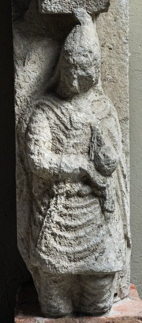 - unten abgebr., stark bestoßen, Nebenseiten des Pfeilers geglättet