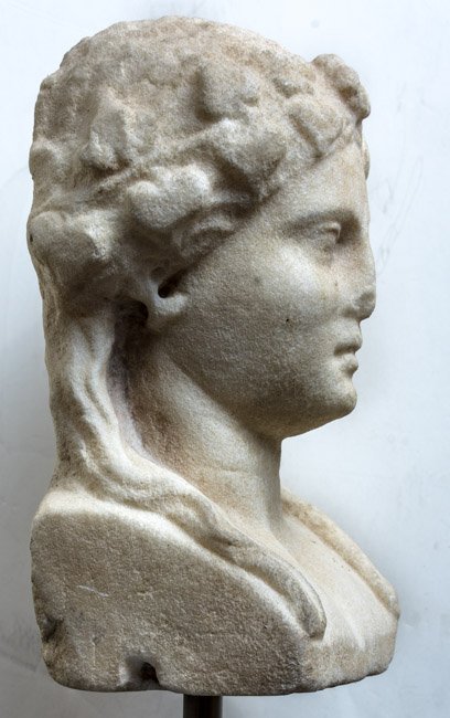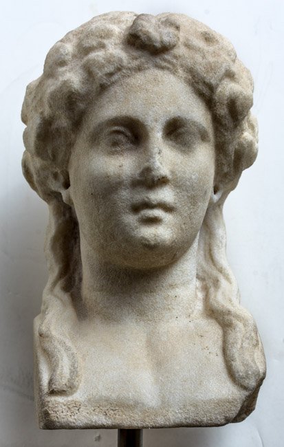 - Mythische Figur: jugendlicher Dionysos mit Schulterlocken und Efeukranz mit Blüte über der Stirn.