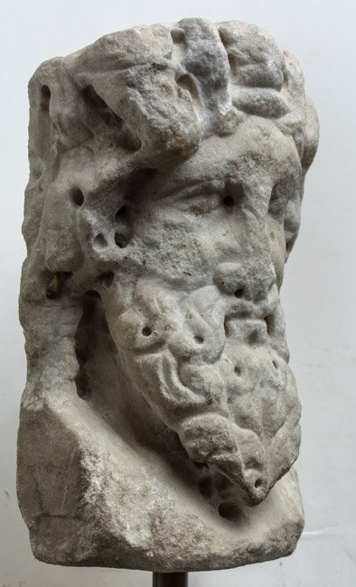 - Mythische Figur: bärtiger Dionysos mit doppelter Binde, Blättern und Früchten (?) im Haar