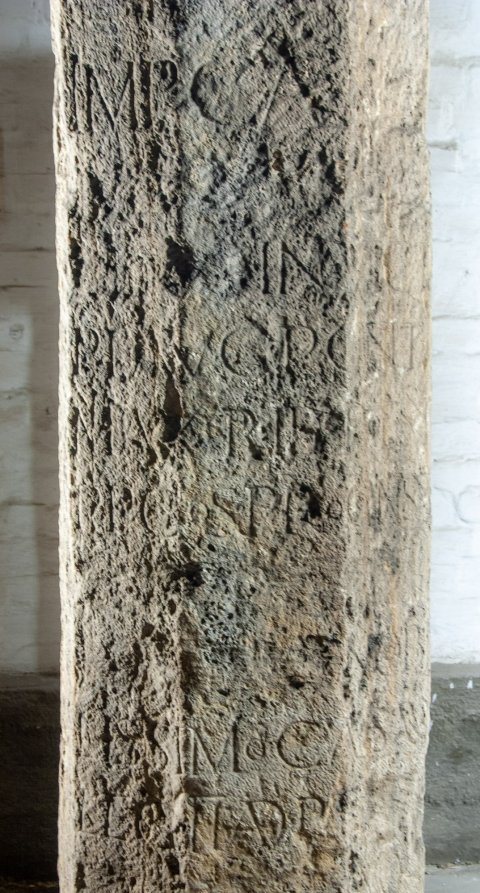 - Imp(eratori) Caes(ari) C(aio) / Iul(io) [Vero Maxi/mino] invicto / p(io) f(elici) Aug(usto) pont(ifici) / max(imo) trib(unicia) potest(ate) / p(atri) p(atriae) co(n)s(uli) proconsul(i) / [et C(aio) Iul(io) Vero] / [Maximo] nobi/lissimo Caesari / leg(io) II ad(iutrix) p(ia) f(idelis) [Ma/ximiniana ab] Aq(uinco) / m(ilia) p(assuum) II