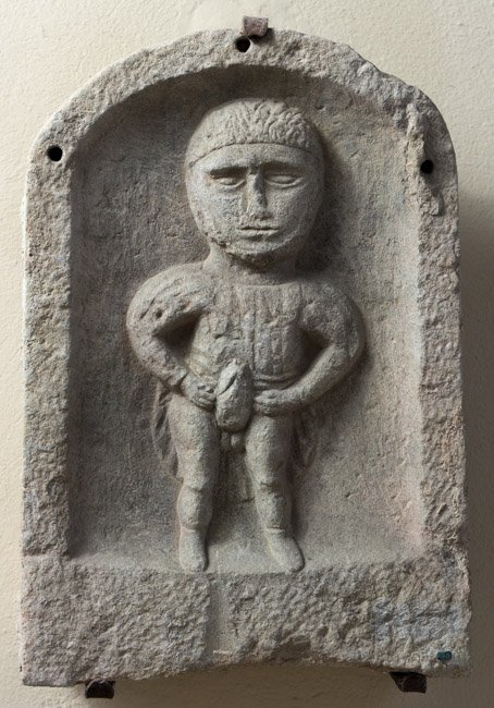 - Mythische Figur: in Nische mit Bogenabschluss stehender Priapus mit entblößtem Phallus.