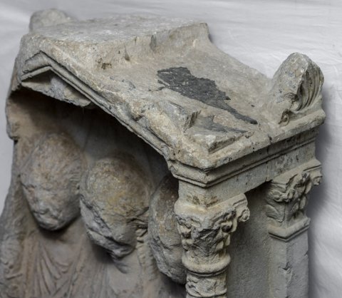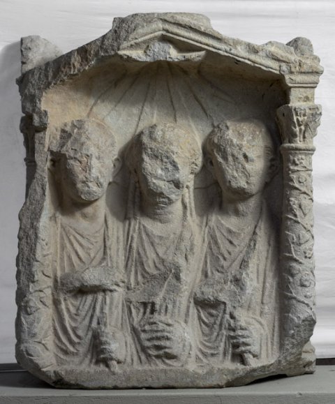 - Giebeldach mit Eckakroteren und kubischem Aufsatz auf der Spitze. Seitenwände mit Pilastern an den hinteren und Rankensäulen an den vorderen Ecken. Unter dem offenen Giebel Muschelnische mit Dreiviertelfiguren von drei Personen (Familie): Frau mit Schulterlocken zwischen zwei bartlosen Männern in Toga, in der linken Hand Rolle (volumen).