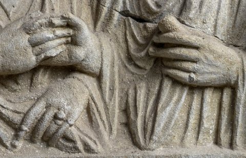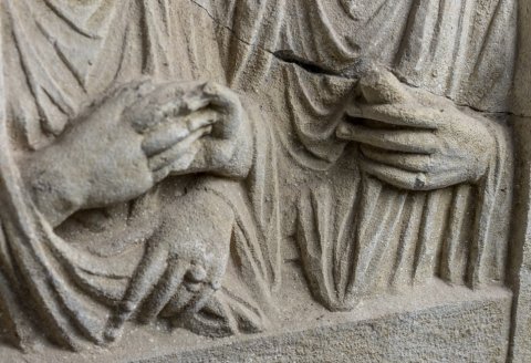 - Zwischen glatten Rahmenleisten zwei Halbfiguren (Ehepaar): Frau in Tunica und Mantel, Mann in Toga, beide mit Fingerring an der linken Hand, Mann mit Rolle (volumen). Unterhalb der Bildnische geglättete Fläche.