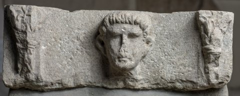 - Zwischen Säulen Porträtkopf eines bartlosen Mannes.