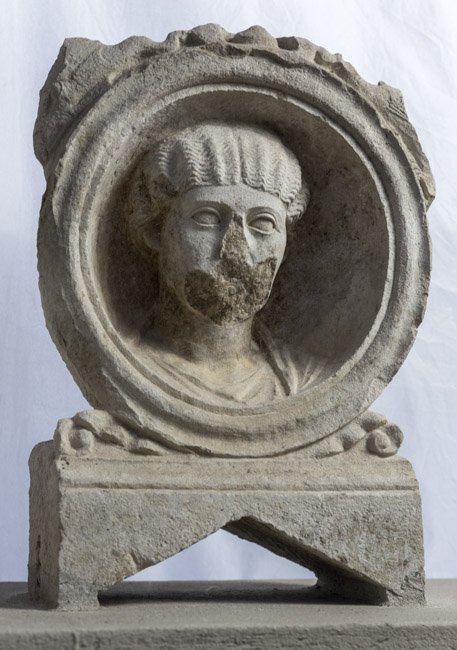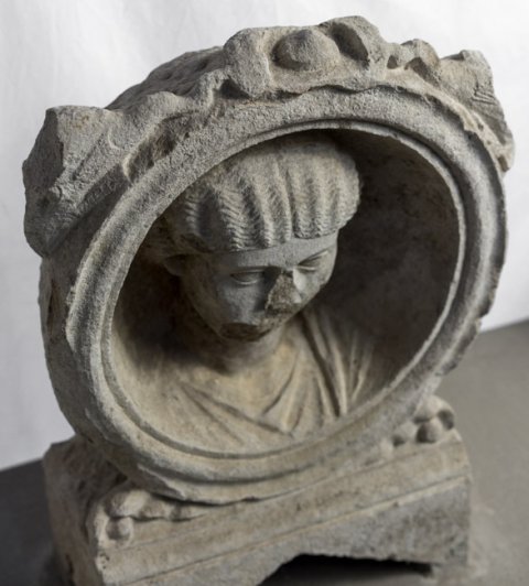 - Auf unten dreieckig ausgeschnittenem Sockel Akanthuskelch, darauf Medaillon (Clipeus) mit Porträtbüste einer jungen Frau mit gewelltem, im Nacken zusammengefassten Haar. Oben auf dem Rahmen zwei Delphine.