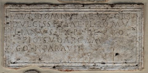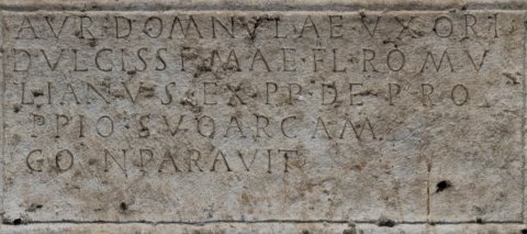 - Aur(eliae) Domnulae uxori / dulcissimae Fl(avius) Romu/lianus ex p(rae)p(osito) de pro/ppio (!) suo arcam / conparavit