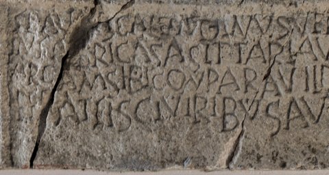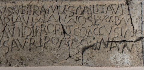 - Flavius Calladinus veteranus militavit / in fabrica sagittaria vixi(t) annos LXXX p(lus) m(inus) / arcam sibi conparavil(!) de proprtco(!) accus(atus) in/ferat fisci viribus auri pondo unam(!)
