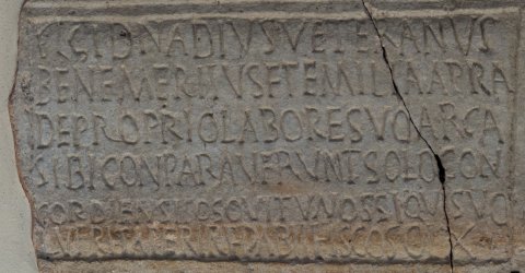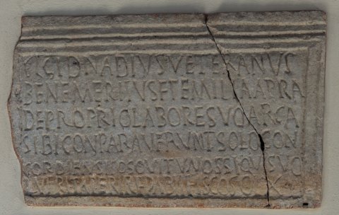- Fl(avius) Gidnadius veteranus / bene meritus et Emilia Apra / de proprio labore suo arca(m) / sibi co<m=N>paraverunt solo Con/cordiensi pos(t) obitu(m) nos(trum) si quis vo/luerit aperire dabit fisco sol(idos) X