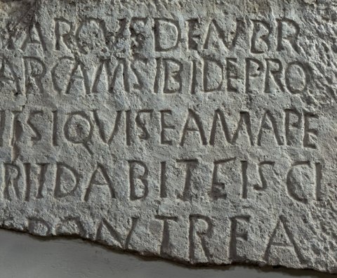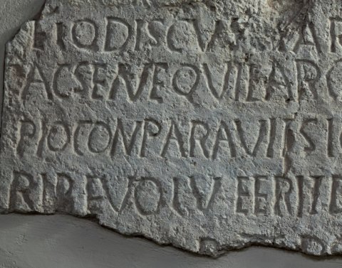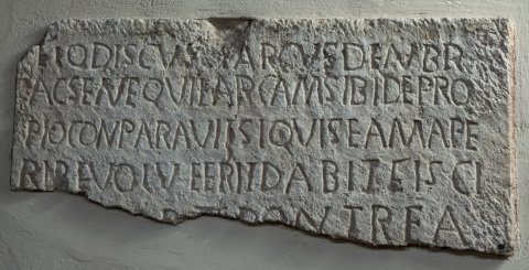 - Fl(avius) Odiscus biarc(h)us de n(umero) br/ac(chiatorum) sen(iorum) equit(um) arcam sibi de pro/p(r)io conparavit si quis eam ape/rire voluerit dabit fisci / viri(bus) ar[g(enti)] pon(do) trea(!)