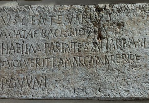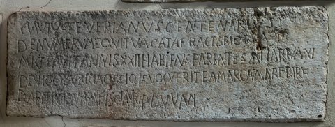 - Flavius Severianus centenarius / de numerum(!) equitua(!) catafractariorua(!) / militavit annis XXII habiens parentes (!) aiiariua(!) XI / de vico Suriliacis si q(u)is voluerit eam arcam aperire / dabit poenam fisci auri p(ondo) duum(!)
