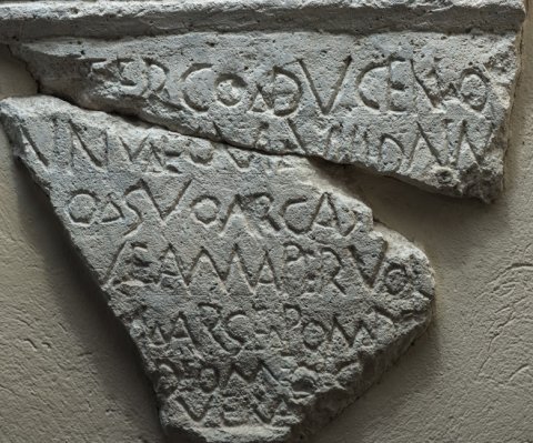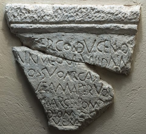- Schriftfeld einer Sarkophagfrontseite, 2 anpassende Fragmente, seitlich abgebr., oben Rahmen
