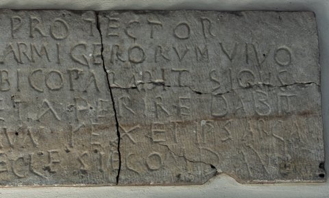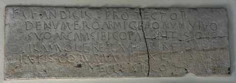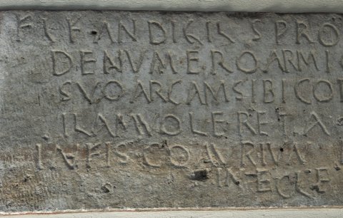 - Fl(avius) Fandigil[du]s protector / de numero armigerorum vivo / [de] suo arcam sibi co(m)parabit. Si quis / il(l)am voleret aperire dabit / in fisco auri un(cias) sex et ips(am) arca(m) / in eclesie com(men)dav(it)