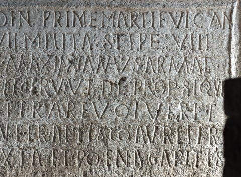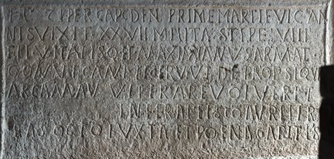 - Fl(avius) Ziper cap(ut?) c(entenarius?) de n(umero) prime Martie vic(tricis) an/nis vixit XXVII milita(vit) stipe(ndiis) VIII / Fi(avi)i Vitalis q(uaestor) et Maximianus armat(ura) / convicani fecerunt de prop(rio) si quis / arcam au(t) viterare voiuerit(!) / [au(t) aperire?] inferat eisco auri iir/ras octo iuxta et poena capitis