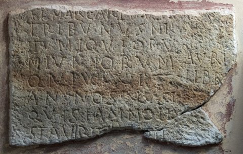 - [D(is) M(anibus)] // Fl(avius) Marcaridus / tribunus mil/itum Iovioru/m iuniorum / qui vixit annos / XLV si / quis eam moli/stavirit in fi(s)co det // auri / libra I