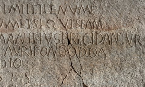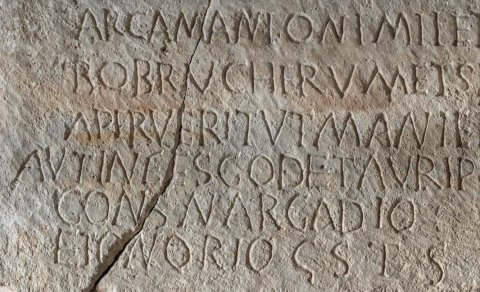 - Arca Manioni milete e nume/ro Brucherum et si quis eam / aperuerit ut mani eius precidantur / aut in fesco det auri pondo doa. / Cons(ulibus) n(ostris) Arcadio / et Onorio (Au)g(u)st(i)s