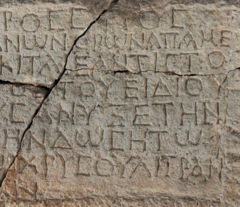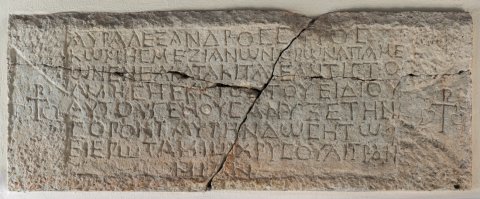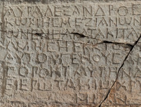 griechisch: Αὐρ(ήλιος) Ἀλέξανδρος Σύρος / κώμης Μεζιάνων ὅρων Ἀπαμέ/ων ἔνθα κατάκιται. Ἐάν τις το/