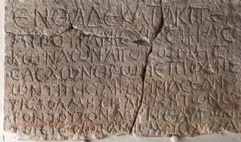 - griechisch: Ἐνθάδε κατάκιτε / Αὐρ(ήλιος) Οὐράνις υἱὸς Ἠρασ/κωνάων ἀπὸ κώμης / Σάσχων ὅρων Ἐπιφανέ/ων τῆς Κύλης Συρίας. Ἐάν / τις τολμήσῃ ἀνύξε τὸν σο/ρὸν τοῦτον, δοῦνε αὐτὼν / τῷ εἱερῷ ταμίῳ χρυσοῦ λ(ίτραν) Α // Ἔτο/υς / ΨLH´
