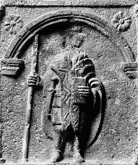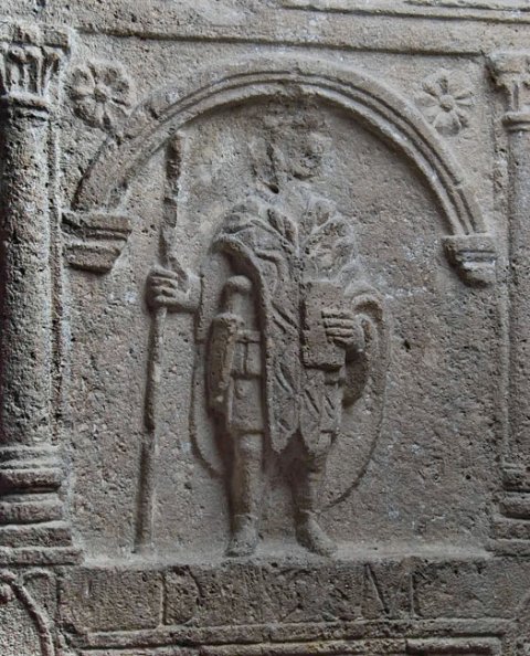 Im Bildfeld Bogennische zwischen Säulen, darin stehende Ganzfigur eines Mannes (Soldat): Paenula, kurze Tunica mit Gürtel, in der Linken Diptychon (?). Waffen: Schwert, Lanze.