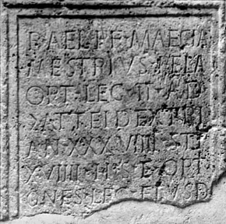 - D(is) M(anibus) // P(ublius) Ael(ius) P(ublii) f(ilius) Maecia / Mestrius Pela(gonia) / opt(io) leg(ionis) II ad(iutricis) / (centuria) Attei Dextri / ann(orum) XXXVIIII stip(endiorum) / XVIIII h(ic) s(itus) e(st) opti/ones leg(ionis) eiusde(m) / f(aciendum) [c(uraverunt)]