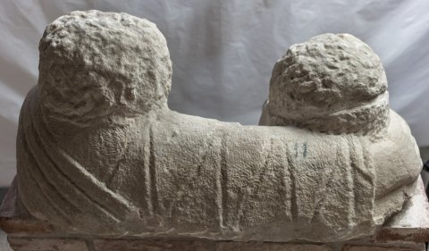 - unten abgeschnitten, links abgebr., Köpfe unfertig (bossiert)