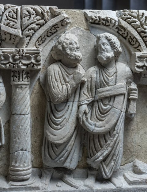 - Frontseite: Säulengliederung mit drei Interkolumnien. Im mittleren unter offenem Giebel stehendes Ehepaar, vor ihnen Erot mit Fackel. Links Mädchen (?) mit Kästchen (zweite Person weggebrochen), rechts zwei bärtige Männer (Philosophen ?), der rechte in Toga contabuata, in der linken Hand Rolle (volumen). Auf der erhaltenen Nebenseite Gorgoneion und Girlande.